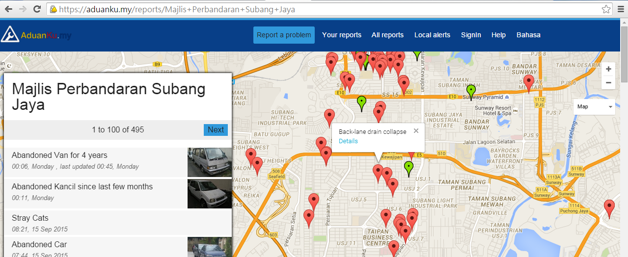 - 英國蘇格蘭大城市愛丁堡(上)、瑞士首都蘇黎世(中)、馬來西亞城市書邦在也 (下) 的 311 案件系統,都是使用 mySociety 所開發的 FixMyStreet 系統。拜 FixMyStreet 為開放改作的開放原始碼專案所賜,各城市都各自做了一些介面上的客製化,也將介面的語言修改成該國的母語。