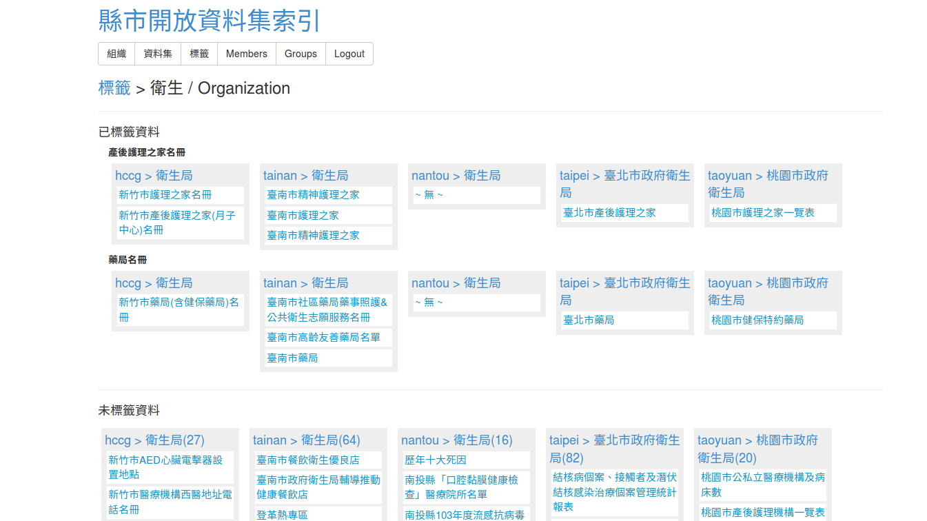- 在檢視資料集時以資料集名稱建立標籤,接著進入檢視標籤的頁面可以看到剛建立的連結,進一步可以用關鍵字搜尋其他資料集建立更多連結
